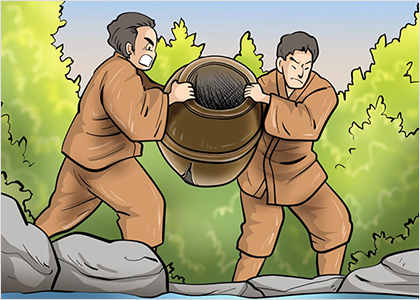 항아리의 안팎으로 물을 가득 채우는 것을